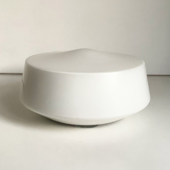 Vintage ceiling lamp industrial / factory ceiling-wall lamp. Bauhaus art deco design. Made in Germany. RZB Rudolf Zimmermann Bamberg DKN Leuchten. Model 10113/27. Metal fixture with porcelain fitting. Can also be mounted on the wall as a wall lamp. A timeless ceiling lamp wall lamp. White opaline frosted glass shade for beautiful diffused light. Without light source. Lamp diameter 20 cm and 10 cm high. In very good condition.