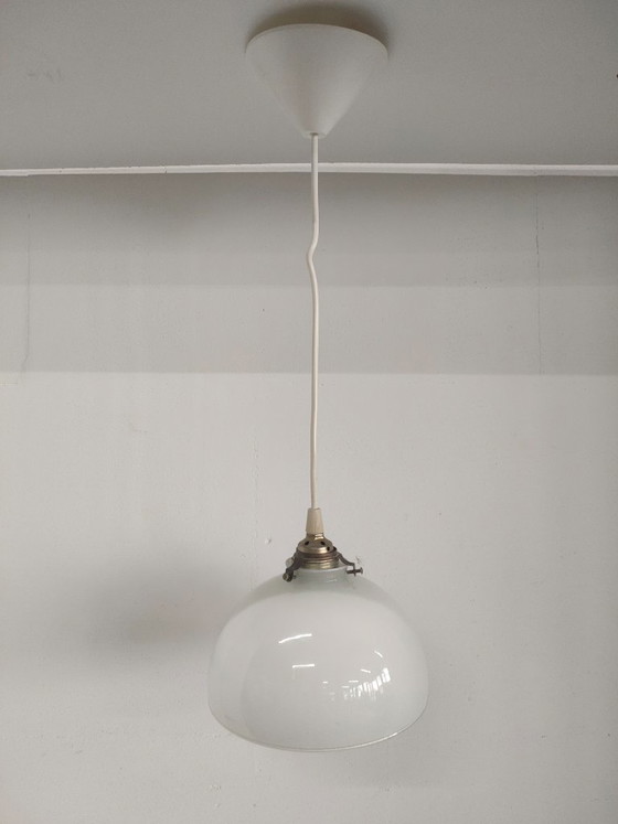 Beautiful round vintage 'opal glass/milk glass' ceiling lamp. A minimalist look; open, classic, and modern all fit together. And yet, in our opinion and taste, this lamp is just right in every way. Estimated period: mid-70s-80s. The lamp is in excellent condition. There are some light signs of use here and there (small scratch), but no noticeable visible damage, no cracks or breaks.
