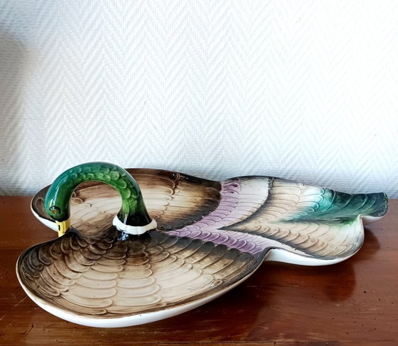 Large glazed ceramic serving platter in the shape of a duck. Superb color effects.