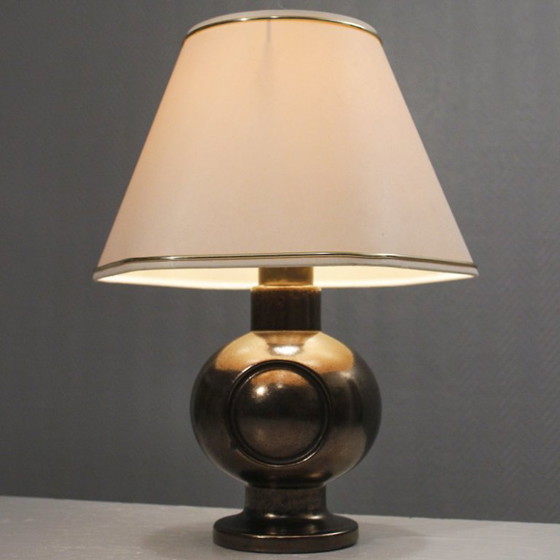 Circa 1950 earthenware lamp base with a black and gold glaze that creates beautiful reflections. Unsigned, to be identified.