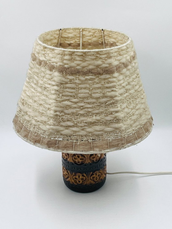 Vintage 1970s lamp in dark brown glazed ceramic with a honey-colored floral relief design. Beautifully crafted with repeated patterns and a geometric frieze, typical of European productions of the seventies.