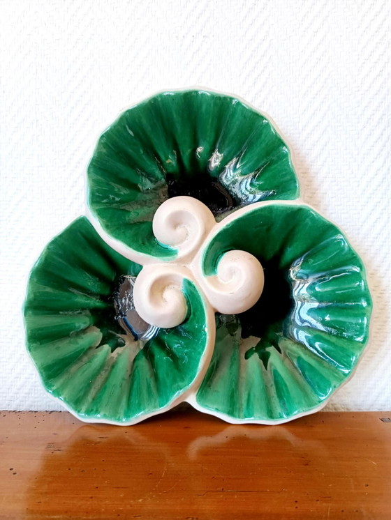 Ceramic serving dish, vintage work circa 1960. Emerald green glazed ceramic dish. In very good condition, with a few small, very discreet chips. 32 x 6 cm. Clean, fast and careful shipment.