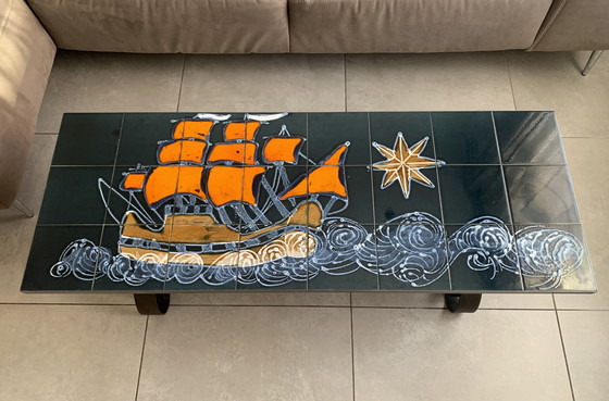 The tabletop consists of hand-painted ceramic tiles featuring an artistic and colorful image of a sailing ship (galleon) on a deep, dark background, complete with an elegant compass rose. The style is strongly reminiscent of the designs of Adri (Belarti) or the renowned ceramic art from Vallauris.