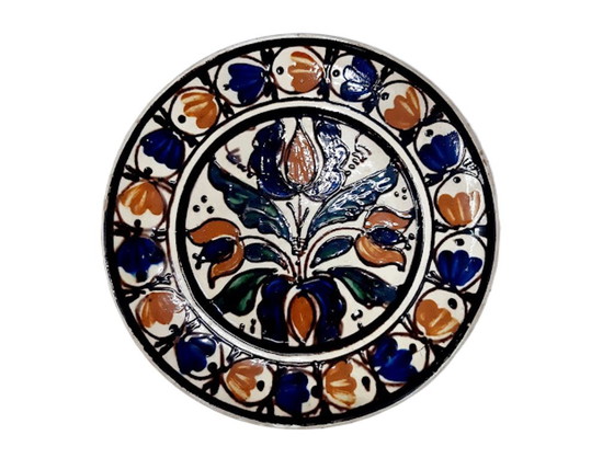 Hand-painted floral motifs in blue, green and brown. The plate is glazed. At the back there are holes and a rope for hanging on the wall. A right decoration.