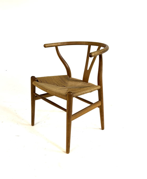 Beautiful iconic chair. Solid oak frame, beautifully organically shaped. This Y-chair model owes its name to the Y-shaped backrest. Also known as the Wishbone chair.