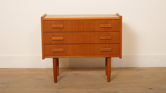 This charming vintage chest of drawers combines elegance with a timeless design. Its compact size makes it perfect for smaller spaces, such as a hallway or against a narrow wall. It features three practical drawers and also makes an excellent stylish vintage bedside table.