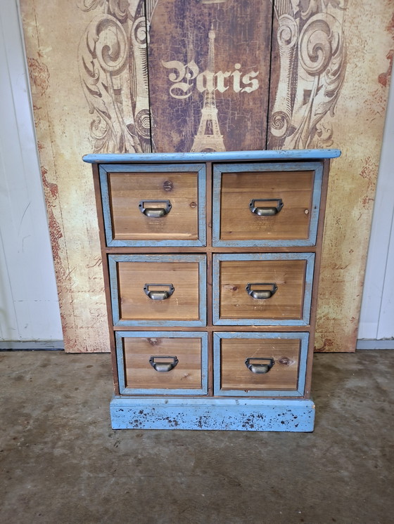 This charming vintage chest of drawers, also known as a medicine cabinet or filing cabinet, offers a unique combination of functionality and aesthetics. Measuring 58 cm wide, 40 cm deep, and 77 cm high, this piece of furniture fits perfectly into a variety of spaces, from a cozy living room to a stylish office environment. - Finished in a beautiful blue and brown color scheme, this chest of drawers exudes timeless charm. - The sturdy wooden construction, combined with metal handles, emphasizes the durability and quality of the design. - Ideal for storing various items, thanks to the spacious drawers that allow for organized storage. Add a touch of vintage flair to your interior with this characterful chest of drawers. Contact us today for more information or to add this unique piece to your collection.