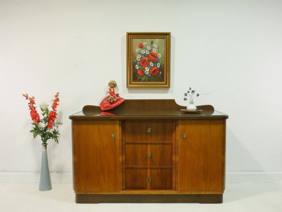 This original vintage piece of furniture from the 1940s impresses with its high-quality workmanship and classic charm. Made from fine oak and walnut wood, it brings timeless elegance to your home.