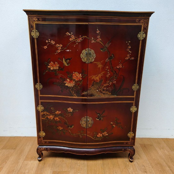 Antique Chinese wedding cabinet in Chinoiserie style. This Chinoiserie cabinet has four doors, with a shelf and a pull-out shelf behind the bottom two doors. It is made of wood and hand-painted. The wall cabinet is beautifully decorated with paintings. A dresser with beautiful hinges and locks. The cabinet is a hi-fi/TV cabinet and therefore has no back panel in the upper section. It also has signs of wear, the most noticeable of which have been clearly photographed.