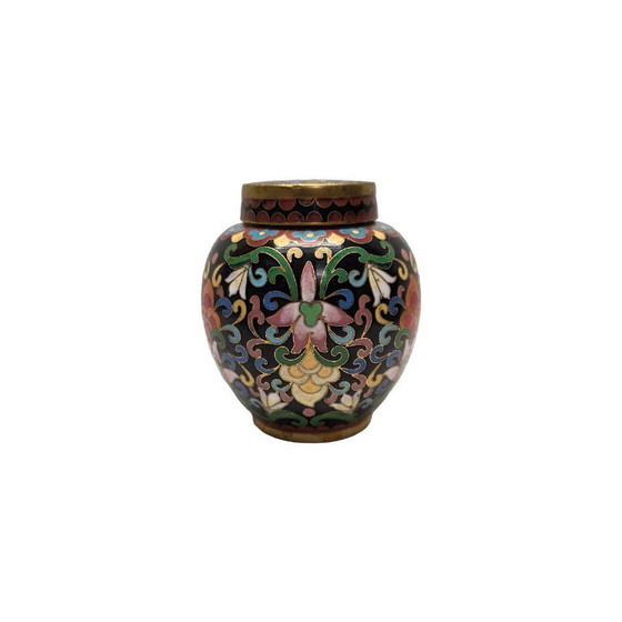 Vintage Chinese cloisonne ginger jar from the 1970s. A lovely small cloisonne ginger jar with a flat lid; they are often typically domed. Decorated all around with colorful floral motifs. The ring on the bottom has a small dent but no damage to the enamel.