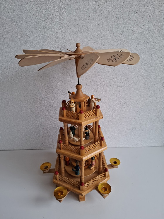 A beautiful vintage Christmas pyramid with 3 floors from the Ore Mountains region. Through the figurines on each floor, the pyramid tells the story of the birth of Jesus Christ including the three wise men, shepherds and angels. Christmas pyramids or Christmas mills are completely handmade from wood in the German Ore Mountains. In Germany at Christmas you will find a Christmas mill in almost every living room; it is part of the Christmas tradition there. On top of the Christmas pyramid are sails and they turn due to the heat of candles that you place in the pyramid. Because of the light from the candles and the spinning motion, the carousel creates an insanely beautiful and atmospheric light show on walls and ceiling German Christmas pyramids are 1 of the most atmospheric Christmas decorations you can have in your home. In perfect condition. Without candles. Size Height 44 cm Diameter wicks. 29 cm For safe shipping, wicks and candle holder were taken out. It is very easy to put back.