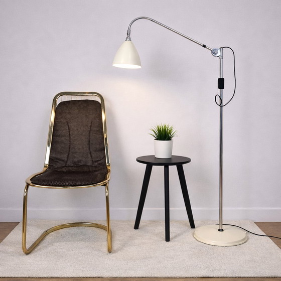 A beautiful designer floor lamp from the Danish brand Gubi, designed by Robert Dudley. This lamp is a true design classic. It is part of the Bauhaus Bestlite series. The lamp can be easily adjusted by slightly lifting the neck, which allows it to move along the stem. The head can also be adjusted by simply moving it. The lamp can also be rotated on its base.