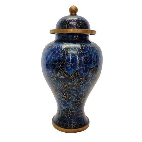 This elegant cloisonné lidded vase from China is a refined decorative object that perfectly combines craftsmanship and color. The deep cobalt blue background forms a beautiful contrast with the finely detailed floral motifs and graceful birds. From the 70s/80s, in neat condition.