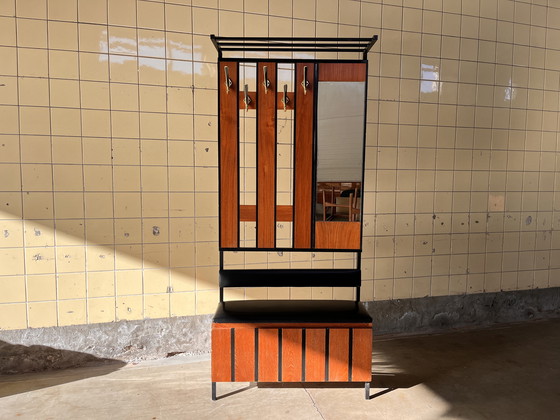 Step back in time with this charming vintage coat rack, perfect for adding a touch of retro flair to your entryway. Its rich brown wood and sleek black metal frame create a striking contrast that's both stylish and functional.