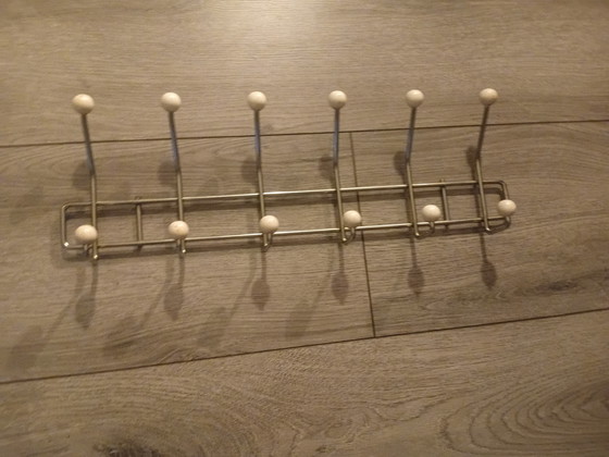 This vintage coat rack adds a touch of nostalgia to your interior. With its elegant metal frame and wooden knobs, this coat rack offers not only functionality but also a stylish look that fits perfectly in a classic or retro decor.