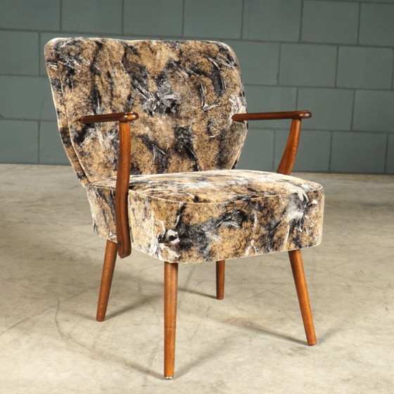 This wonderfully charming armchair dates from the 1960s. It's upholstered in a beautiful, thick velvet fabric with a playful leaf motif. The armrests and legs are made of walnut, creating a lovely contrast with the warm upholstery. Besides its beautiful design, the armchair is also very comfortable. Considering its age, the chair is in excellent condition. It still has its original upholstery, which is undamaged and unstained.
