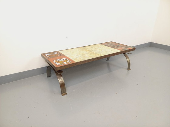 Vintage rectangular coffee table from the 1960s and 1970s, designed by Jean Gregorieff for Roche Bobois. Top with superb ceramic tiles in shades of orange, tile, ochre, yellow, white, and jade. Two tiles depict stylized boats and fish; the other tiles have a magnificent crackled effect. Brushed steel base. Very good overall condition with a patina of age and only a minor restoration on one ceramic tile (visible in the photo).