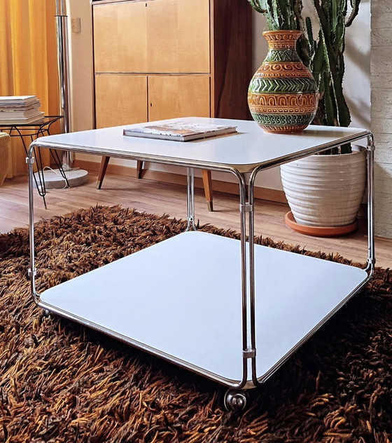 This vintage coffee table is a real eye-catcher in your living room! With its sleek white top and silver-colored metal frame, it adds a touch of retro charm to any room. The table is not only stylish but also practical thanks to the extra storage space underneath. Its casters make it easy to move.