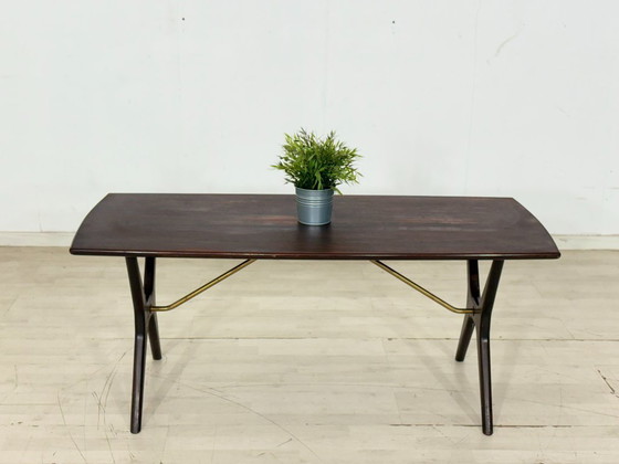 For sale is a beautiful vintage coffee table by Karl Erik Ekselius from the 1960s. The elegant design, the exquisite rosewood grain, and the delicate brass supports make this piece a stylish mid-century classic.