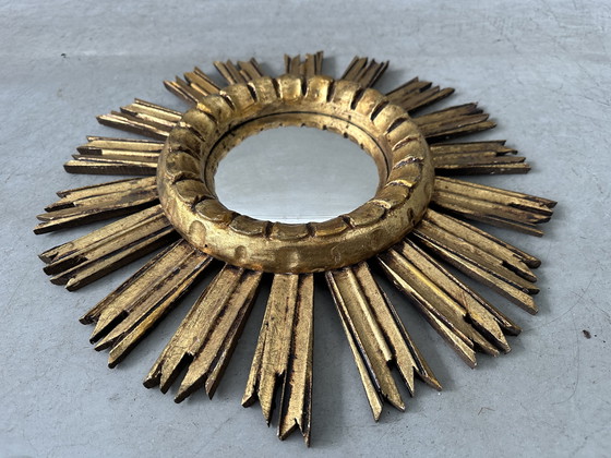 Original convex solar mirror in wood. Most mirrors offered are reproductions from resin. The convex mirror glass is fully intact. Light, acceptable signs of age. Diameter: 43cm. Depth: 5cm.