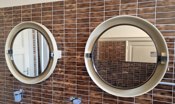This vintage wobble mirror set with lights is a unique addition, ideal for a retro bathroom. The set includes two round mirrors with built-in lights, ideal for an atmospheric look. The mirrors are rimmed with a cream-colored plastic casing and have metal accents. Perfect for lovers of retro and vintage styles.