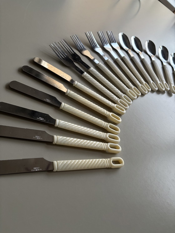 Vintage cutlery set with plastic white handles.