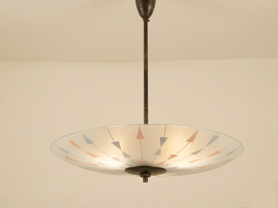 The lamp features a large shallow glass shade decorated with iconic atomic arrow motifs in soft pastel orange and blue – a classic design language of the Brussels style era inspired by the optimism of the Space Age.