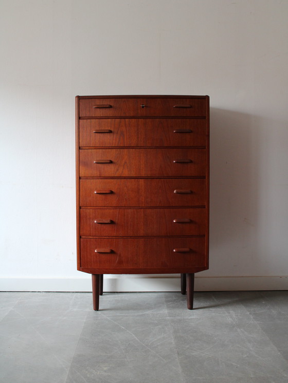 Beautiful tall vintage chest of drawers crafted from teak and produced in Denmark by Ølholm Møbelfabrik. It is beyond doubt that this piece of furniture displays the characteristics and quality of this top Danish designer. Danish furniture is known for its high-quality production, featuring sleek design and refined details. Designs of this nature are typical of Danish mid-century design, where functionality and elegance go hand in hand.