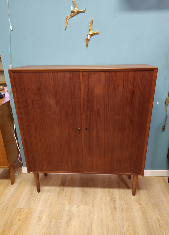 Beautiful vintage highboard or wardrobe by the Danish brand Brouer. This Danish design piece of furniture is characterized by beautiful wood joints. The shelves are not original, but are adjustable, providing flexible storage options. A stylish addition to any interior.