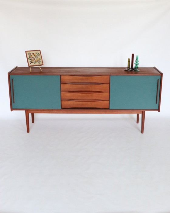 Beautiful teak Danish sideboard with blue-green doors in the style of designer Arne Vodder. Thanks to the drawers and shelves, this practical cabinet offers plenty of storage space. The cabinet had two white-painted sliding doors. Unfortunately, the paint was difficult to remove, so we wrapped the doors in this cool blue-green color! Due to its dimensions, the cabinet is also perfect as a TV stand.