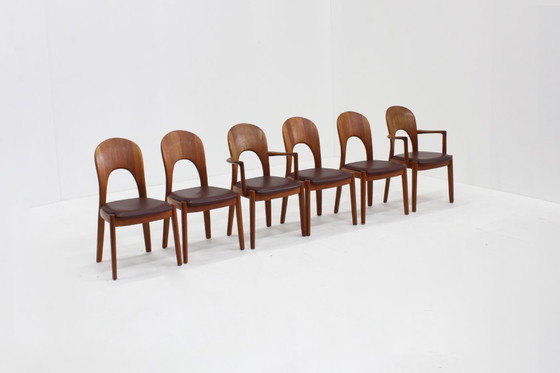 Set of 6 Danish dining chairs with a sturdy solid teak frame and brown leatherette upholstery.