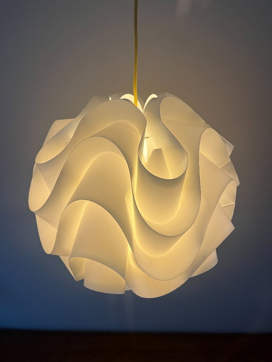 A beautiful plastic origami pendant lamp designed by Poul Christiansen in 1971.