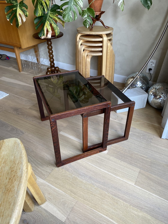 Add a touch of Danish elegance to your living space with these vintage smoked glass side tables. The rich brown wood frame beautifully complements the sleek black smoked glass top, creating a timeless piece perfect for any decor. Ideal for showcasing your favorite decor items or as a functional addition to your seating area.