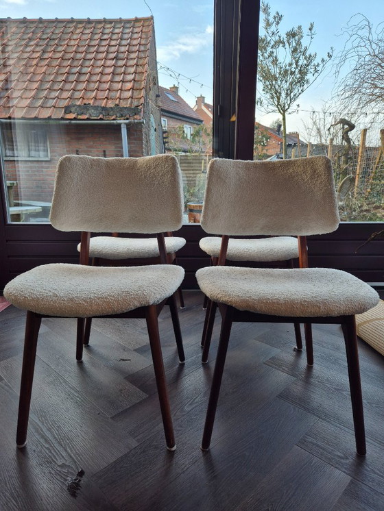 It's with a heavy heart that I'm selling these self-refurbished vintage dining chairs with their beautiful walnut-like frames. I've reupholstered the chairs, sanded and treated the wood, and now they look fantastic again. Two chairs are reinforced with a barely visible screw, see photos. I just cleaned the teddy fabric with a fabric cleaner, so they're ready for a new home! After a while, we needed dining chairs with armrests. Who can I please?