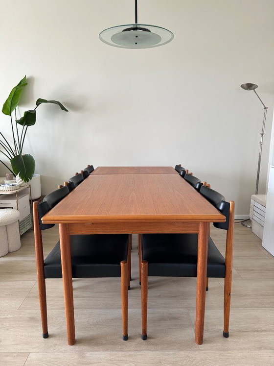 Beautiful vintage Danish extendable table by Høng Stolefabrik. Made of teak wood. It features a convenient extension function that allows the table to be easily adjusted to the desired number of guests, e.g. 4, 6, or 8. The extension mechanism works well on both sides, but may be slightly stiff due to the age of the table. The table is in good, used condition.
