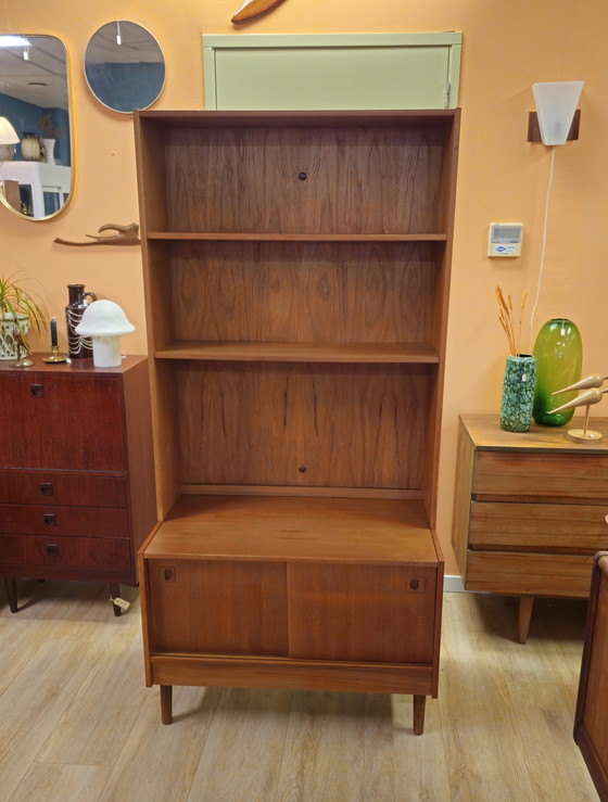 Bookcase, finished in teak veneer. The cabinet features elegant sliding doors with inlaid handles and stands on characteristic round teak legs. This piece of furniture consists of two parts that click together easily, creating a sturdy and stable unit. A stylish addition to any interior with a penchant for Danish design.