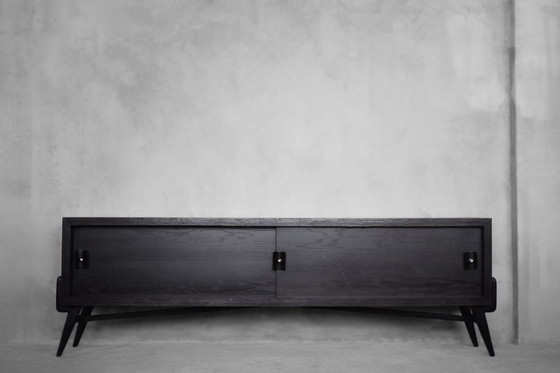 This modernist sideboard was made in Scandinavia during the 1960s. It was made of oak wood, which is considered royal wood. It is a very strong and durable material with rich grain. The wood is resistant to scratches and damage, and becomes noble with age. This sideboard is finished in a dark, varied color. From brownish tones to intense dark brown, which, depending on the angle of light, may give the impression of black. The strong, patterned grain flows harmoniously here. This creates a stuning visual effect. The front is a pair of sliding doors. There is one shelf and empty space inside. The geometric handles are made of wood supplemented with a metal ball. Elegant wooden legs perfectly match the sideboard. The multi-dimensional design of the furniture, materials used, non-obvious color and workmanship with the utmost care make it an extremely interesting object that will fit into many arrangements, from industrial to modern interiors.