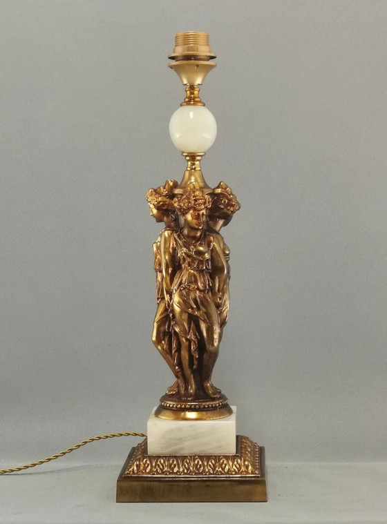 A vintage Deknudt table lamp featuring an elegant trio of goddesses or graces.