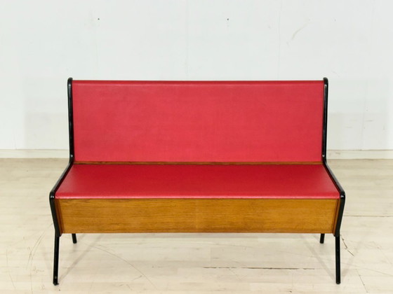 For sale is an exceptional vintage bench that impresses with its striking design and exciting mix of materials. The warm, solid oak frame harmonizes perfectly with the minimalist black metal legs and the vibrant red upholstery.