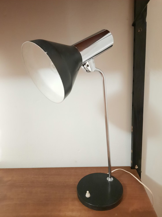 Vintage desk lamp. Seventies. Beautiful sleek appearance. 50cm high, with adjustable arm. In excellent vintage condition. The old plug (see last photo) has since been replaced with a new one for safe modern use.
