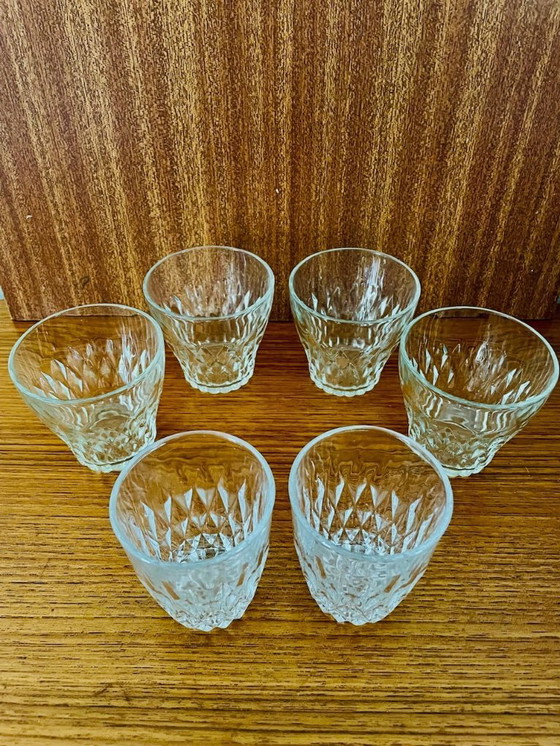 Vintage, diamond cut, water or lemonade glasses made by Vereco and Duralex France, circa 1950's - 1960's , set of 6. Made of tempered glass, the design is elegant, sleek and modern all at once, showcasing a very cool, diamond-shaped pattern on the surface, that truly pops (see photos.). Glasses are in overall very good, original, and vintage condition, with very light marks, signs of age and previous use commensurate with time, as well as a patina of time, on the surfaces, edges, rims and underneath (see multiple photos.) No cracks or chips (see photos). All glasses carry their maker's mark underneath: The set of 4 “VERECO France" (before 1953), and the set of 2 “Duralex” (after 1953), and are stackable, (see photos.) They have only been gently cleaned with respect to their original patina of time. All photos have been taken in natural, indoor light, so colors may vary, based upon brightness, reflections, angles and perspective, in which they are viewed. DIMENSIONS: