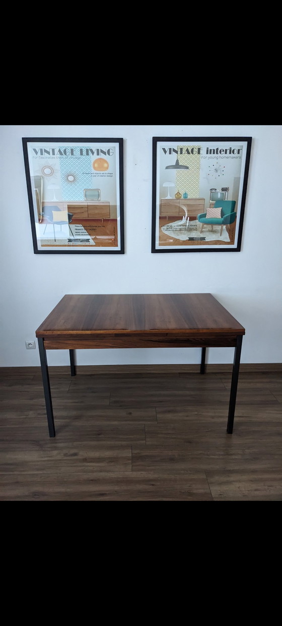 Discover this elegant vintage dining table, a timeless addition to any refined interior. Its richly grained wood top rests on black metal legs, creating a striking and modern contrast.