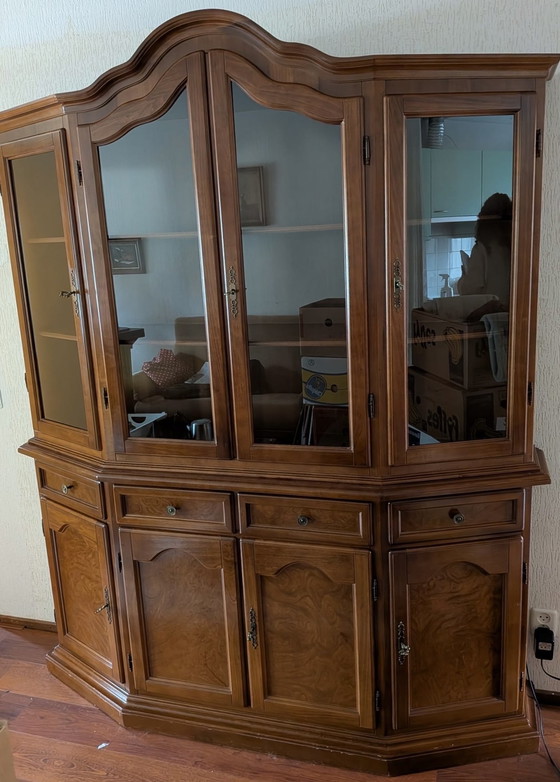 Beautiful large display cabinet, warm wood, probably oak.