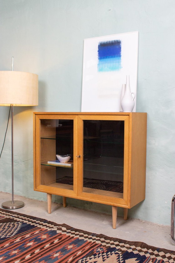 This display cabinet appears light and understated thanks to its light wood tone and clean lines. The proportions are harmonious, and the slightly tapered legs provide the cabinet with good stability without making it seem heavy.