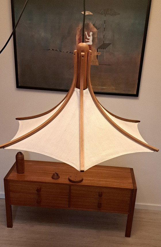 The lamp consists of elegantly curved teakwood struts with a stretched fabric shade. This creates a very warm, indirect light – ideal above a dining table or as a focal point in the living room.