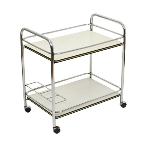 High-quality trolley. The Formica tops are in very good and neat condition, with only minor signs of wear such as some surface scratches, but the color makes them completely unnoticeable. The chrome tubular frame has been lightly polished, retaining its charming patina. There is a bottle rack at the bottom.