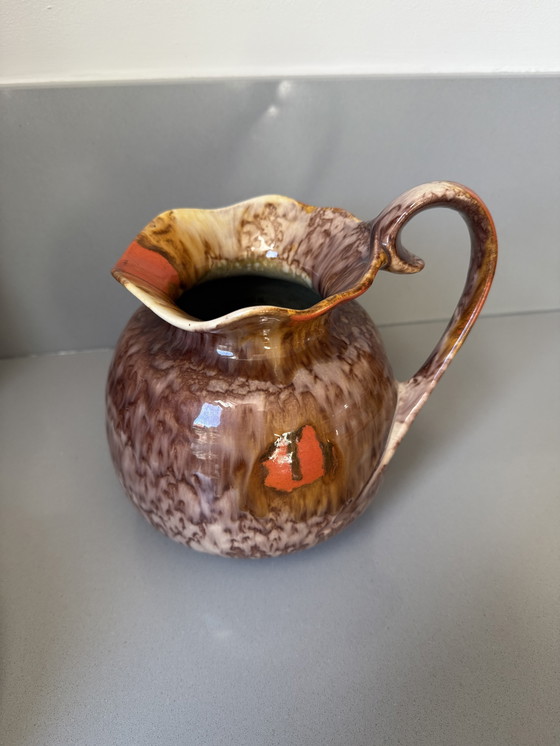 This vase has the characteristic lotus shape with an asymmetrically wavy pouring rim and an elegantly curled handle. The hand-applied drip glaze in brown, cream, and ochre is beautifully accentuated by the typical orange-red decoration, both on the rim and the body.