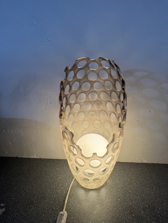 This vintage egg-shaped lamp from the 1990s, designed by Zijstra in the Netherlands, features an abstract design with a perforated pattern. Its unique texture casts interesting shadows, making it a striking addition to any room. Crafted from durable plastic, the cream-colored lamp adds a touch of elegance to the modern design.