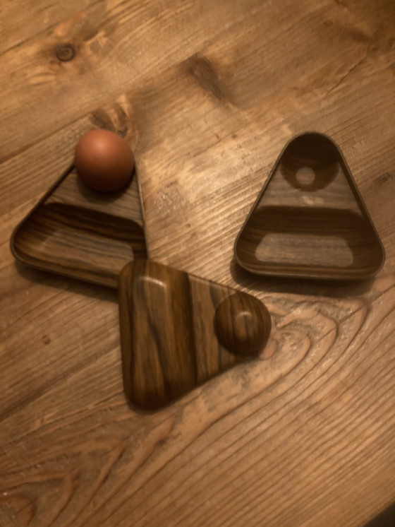 Step back in time with this exquisite set of three vintage egg cups by Robex/Caleppio. Crafted from durable plastic, these egg cups feature a charming wood grain texture that adds a touch of rustic elegance to your breakfast table. Perfectly preserved, they are in immaculate condition, ready to bring a nostalgic flair to your dining experience.