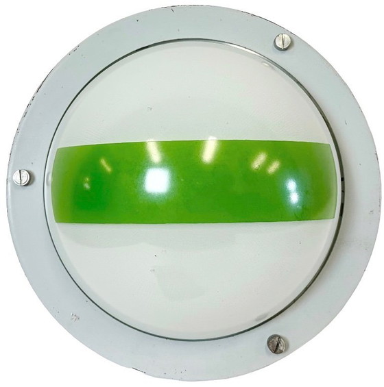 Vintage industrial emergency wall light made by Elektrosvit in former Czechoslovakia during the 1970s. It featutes a light grey iron body and a milk glass cover.